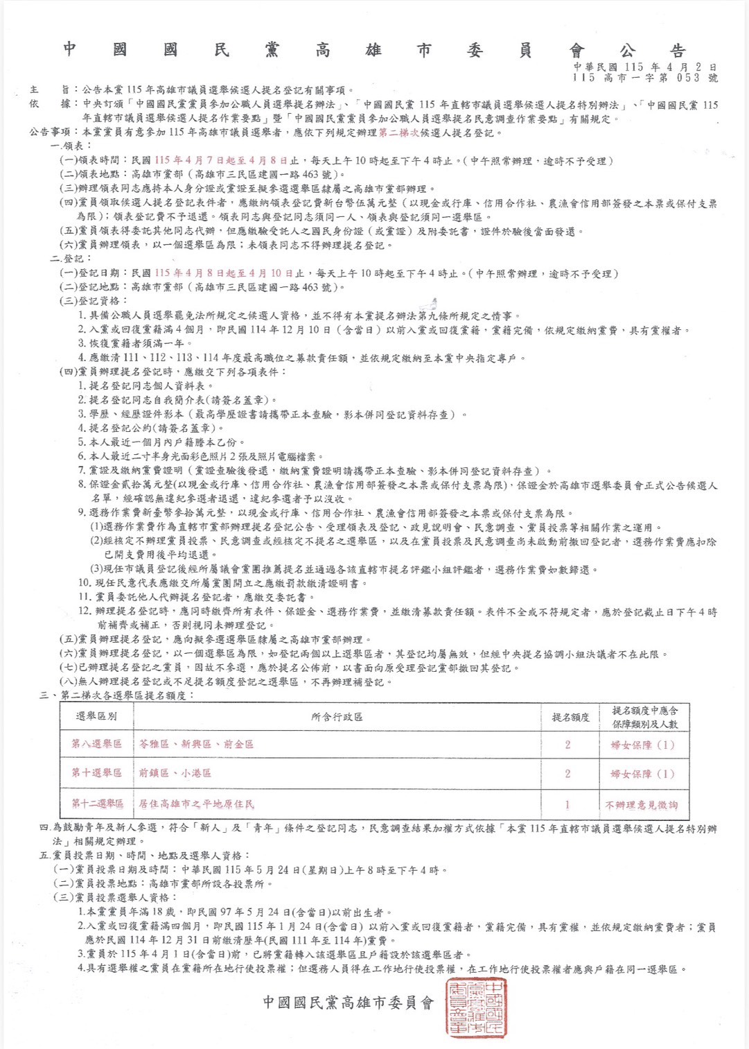 中國國民黨高雄市委員會今日上午10點公告 …